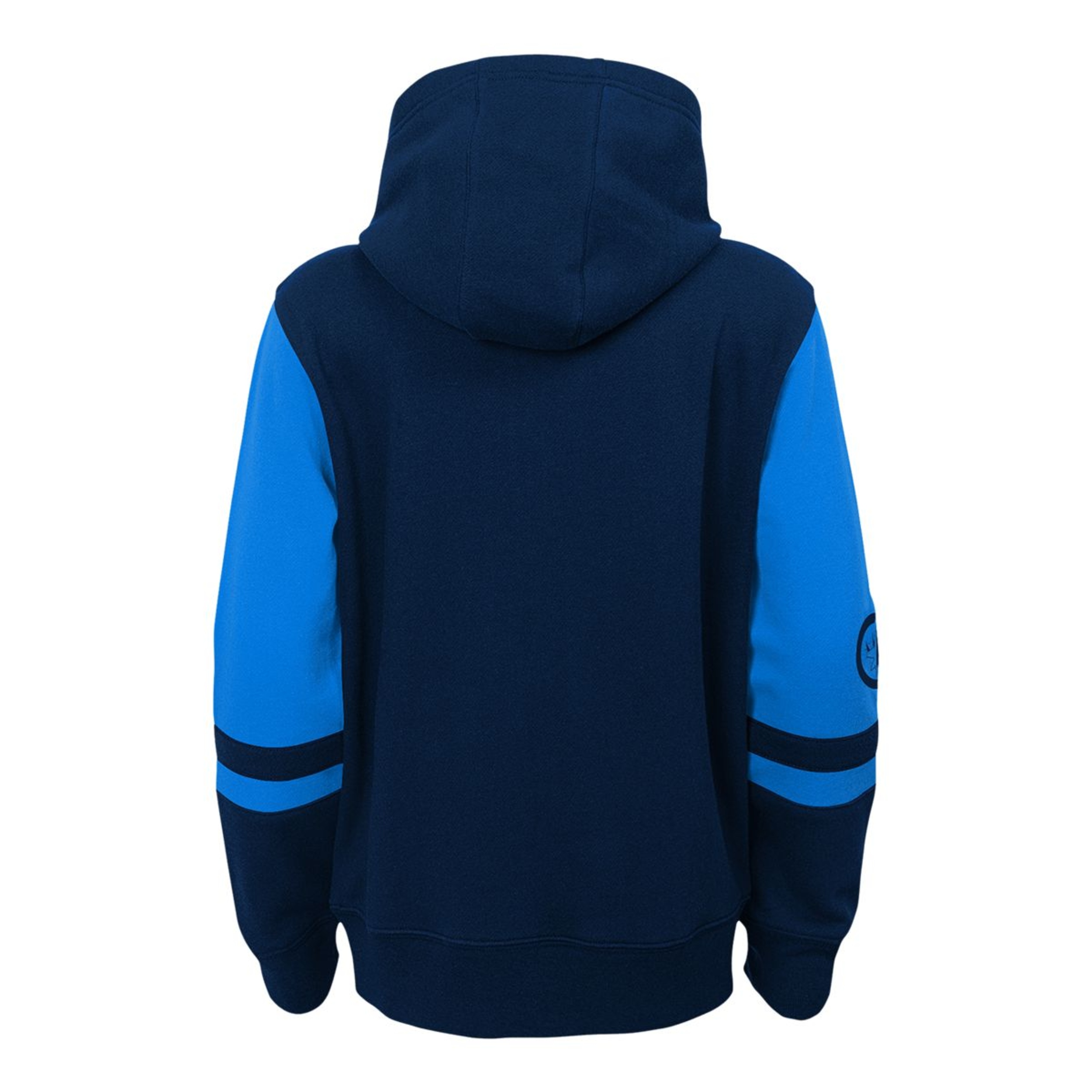 The NHL Face Off Full Zip fleece hood is a core staple for any young NHL Fan. Team and alternate colour based design with oversized team logo at left center chest. Comfortable cotton polyester blended fleece fabrication. Relaxed styling with full length zip and utility pockets. Contrast jersey lined three panel hood. Officially licensed by the NHL. Youth 8-20 size range.