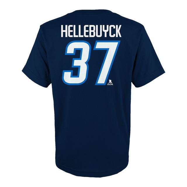 This Winnipeg Jets team colour NHL player name and number short sleeve cotton tee is a must have for any young Jets fan. Authentic navy blue design with Jets team logo screen print at center chest. Complete with Connor Hellebuyck #37 name and number on back. Officially licensed byte NHL and NHLPA. Youth 8-20 size range.