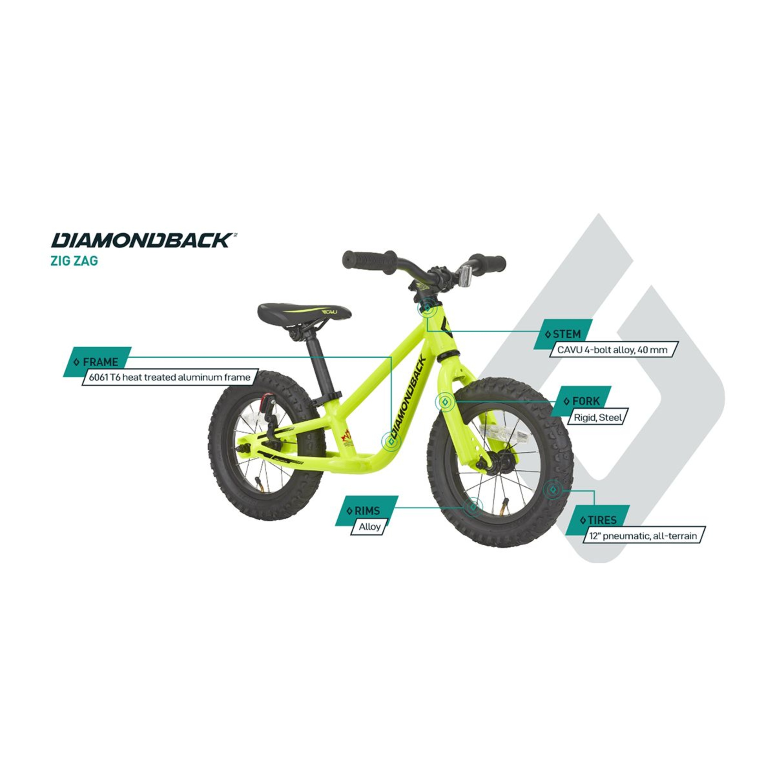 Give your kid a running start to their bicycle adventures with the Diamondback Zig-Zag balance bike! Designed to develop the natural balance skills of a toddler on two-wheels before introducing pedals, the Zig-Zag balance bike allows them to run before the pedal! Engineered with durable lightweight materials, the Zig-Zag balance bike is tough enough for any kid learning to ride.