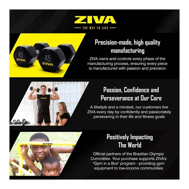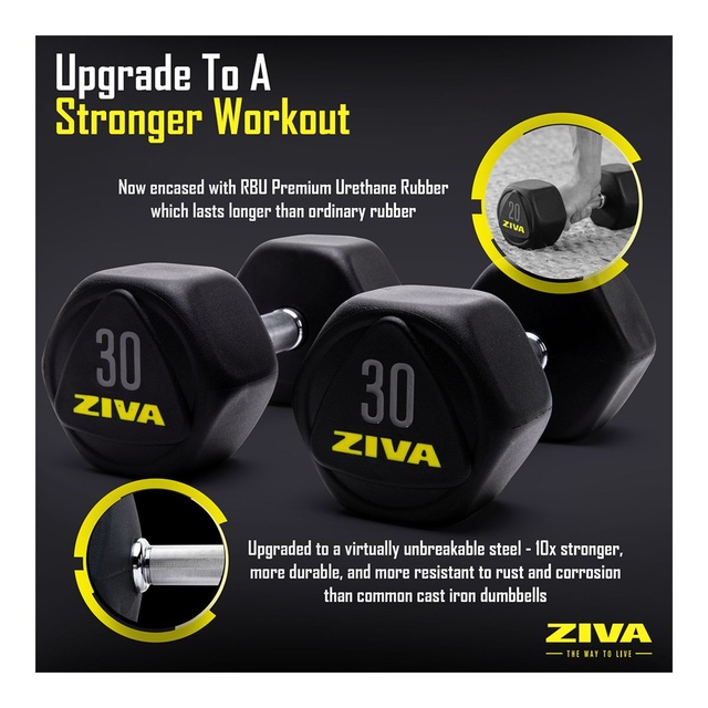 Dumbbells have been the foundation of every gym for as long as home gyms have existed, but we’ve pushed aside the tired old designs of the past, and created elite-level strength and hypertrophy tools that are the perfect harmony of form and function. ZIVA Hexagon RPU Dumbbells offer a sleek, eye-catching alternative to the shabby steel-grey iron chunks of yesteryear, featuring textured, hard-wearing, long-lasting RPU coatings over the dumbbells’ heads; corrosion-, wear-, and rust-resistant chrome-coated handles; modern aesthetics in a no-roll design; and always reliable, world-class ZIVA quality.